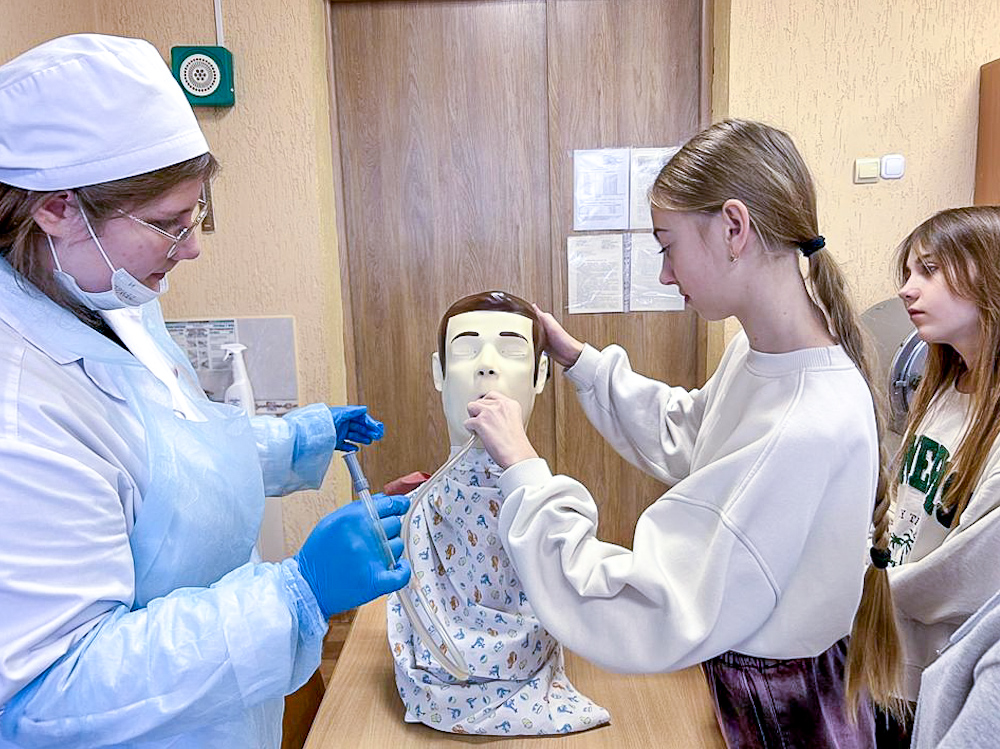 Преподаватели колледжа вместе с учащимися провели мастер-классы с использованием симуляционного оборудования по измерению артериального давления, подкожному введению лекарственного препарата, взятию крови на биохимическое и серологическое исследования, взятию мазка на бактериологическое исследование и промыванию желудка при отравлениях. Ребята с большим интересом попробовали себя в качестве будущих медицинских работников.