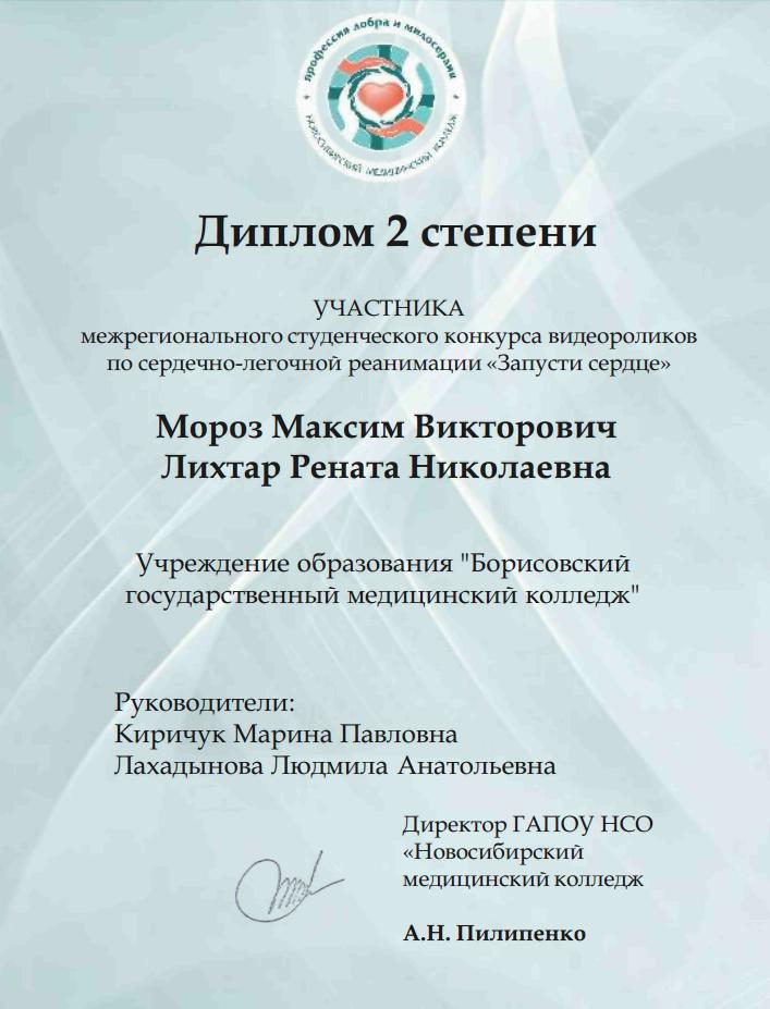 Мороз Максим и Лихтар Рената, учащиеся учебной группы ЛД-233, стали участниками Межрегионального студенческого конкурса видеороликов по сердечно-легочной реанимации «Запусти сердце». Организатором конкурса выступил ГАПОУ НСО «Новосибирский медицинский колледж».