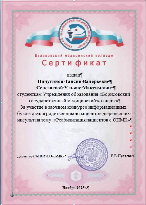 Подведены итоги заочного конкурса информационных буклетов для родственников пациентов, перенесших инсульт на тему: «Реабилитация пациентов с ОНМК». Организатор конкурса – ГАПОУ Саратовской области «Балаковский медицинский колледж».