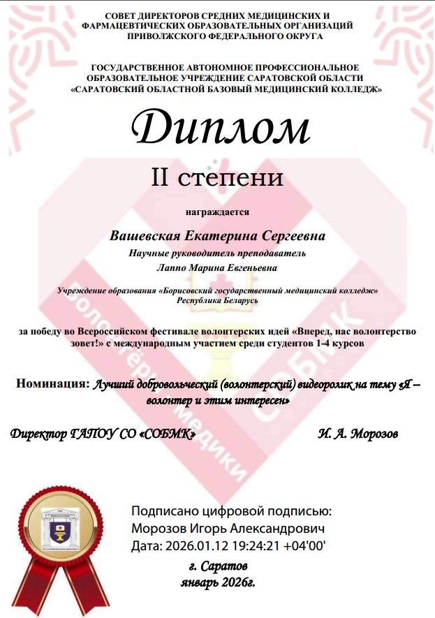 Подведены итоги Всероссийского фестиваля волонтерских идей «Вперед, нас волонтерство зовет!», который проходил в декабре 2025 года. Организатором фестиваля выступил Саратовский медицинский колледж.