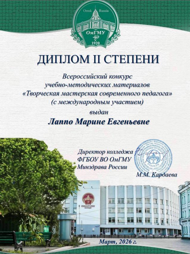 Подведены итоги Всероссийского конкурса учебно-методических материалов «Творческая мастерская современного педагога». Участниками конкурса стали преподаватели учебного предмета «Сестринское дело и манипуляционная техника» Лаппо Марина Евгеньевна и Черникова Марина Сергеевна. Организатором конкурса выступил колледж ФГБОУ ВО ОмГМУ Минздрава России.