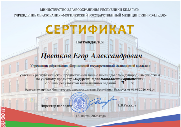 Цветков Егор, учащийся учебной группы ЛД-231, стал участником Республиканской предметной онлайн-олимпиады с международным участием по учебному предмету «Хирургия, травматология и ортопедия».