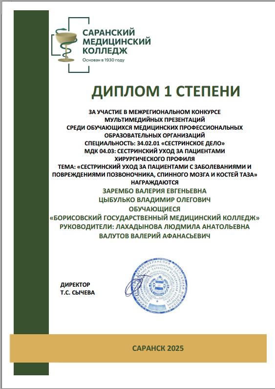 Зарембо Валерия и Цыбулько Владимир, учащиеся учебной группы СД-243, стали участниками межрегионального заочного конкурса мультимедийных презентаций по теме: «Сестринский уход за пациентами с заболеваниями и повреждениями позвоночника, спинного мозга и костей таза». Организатором конкурса выступил ГБПОУ Республики Мордовия «Саранский медицинский колледж».