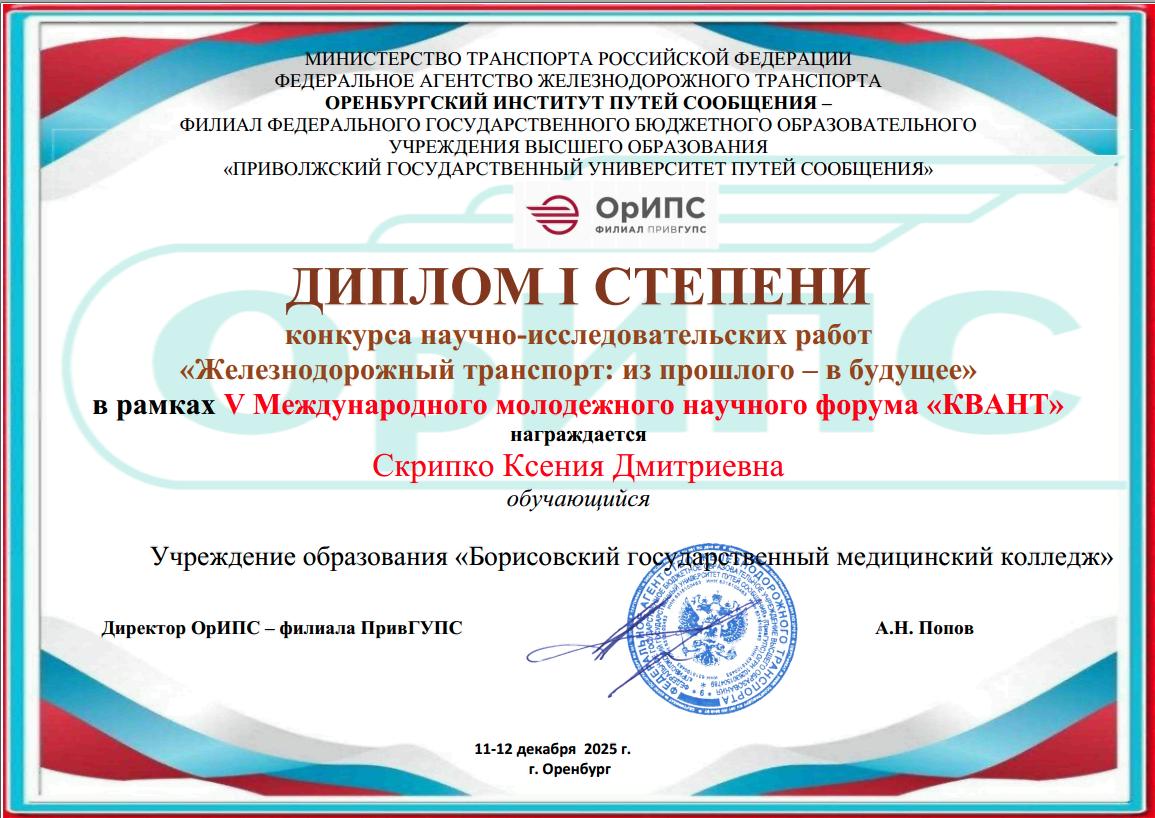 Скрипко Ксения, учащаяся учебной группы ЛД-231, под руководством преподавателя Киричук Марины Павловны подготовила конкурсную работу «Безопасность на рельсах: как преодолеть разрыв между знанием и поведением». Результат – Диплом I степени.