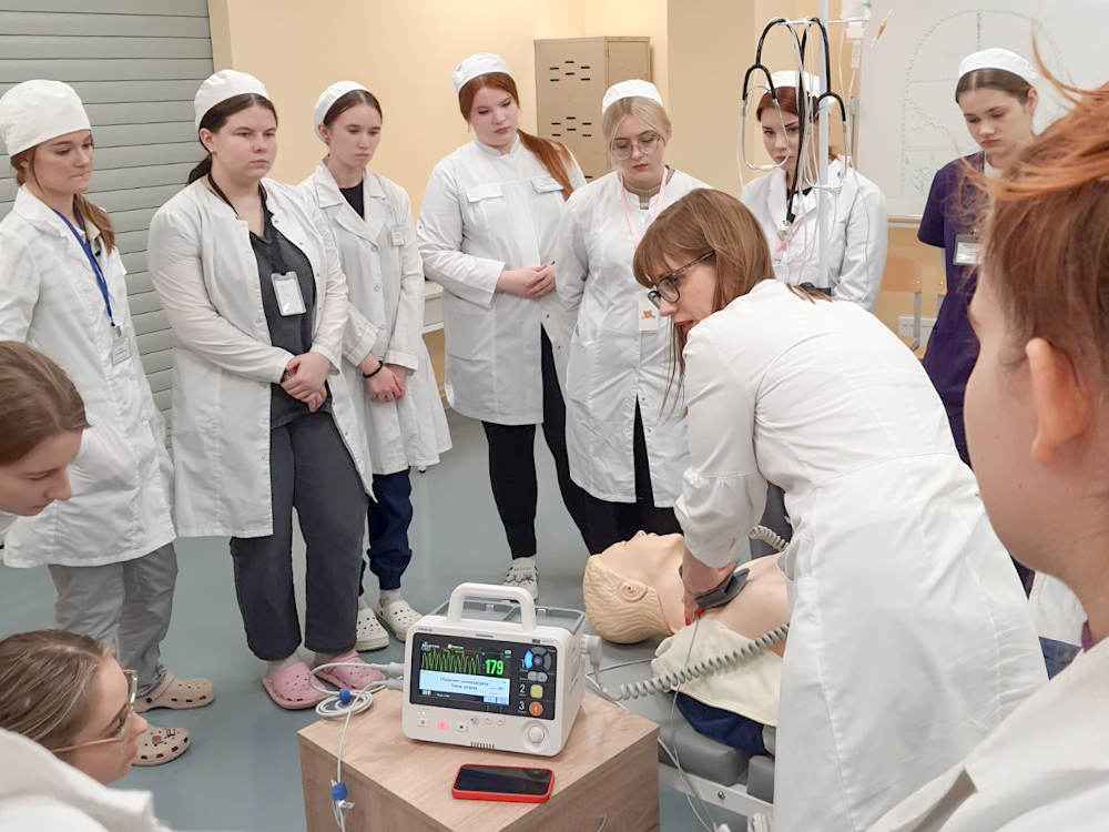 Преподаватель Кузнецова С.И. продемонстрировала использование бифазного дефибрилятора при ЭИТ, который позволяет быстро и эффективно оказать помощь пациенту. Учащиеся колледжабыстро и чётко выполняли назначения врача, задавая уточняющие вопросы, что позволило отработать коммуникации между врачом и медицинской сестрой в ходе практического занятия.