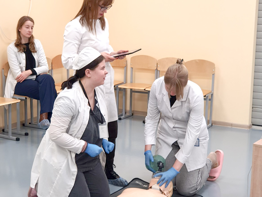 26 ноября состоялось сетевое взаимодействие на базе практико-ориентированного корпуса БГМУ с участием преподавателя Каллаур Т.А., учащихся учебной группы ЛД-231(1) и студентов 6 курса педиатрического факультета БГМУ по теме: «Оказание неотложной медицинской помощи при анафилаксии на укус насекомого». Проводилась отработка навыков сердечно-лёгочной реанимации по оказанию неотложной медицинской помощи при анафилаксии, инородных телах верхних дыхательных путей. При работе учащихся прослеживалась не только хорошая практическая подготовка при выполнении навыков, но и была отмечена хорошая работа в команде при взаимодействии врач-помощник врача.