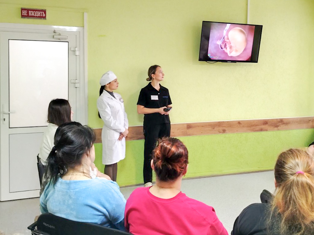 Учащиеся рассказали пациентам отделения патологии беременности о физиологическом течении беременности и родов, о партнёрских родах и приёмах самообезболивания в родах. Были продемонстрированы элементы массажа, позы и техники дыхания, применяемые в родах, кто может быть доулой, чем она занимается на родах и её отличие от акушерки.