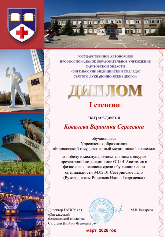 В марте 2026 года на базе ГАПОУ СО «Энгельсский медицинский колледж Св.Луки (Войно-Ясенецкого)» прошел межрегиональный заочный конкурс презентаций по учебному предмету «Анатомия и физиология».