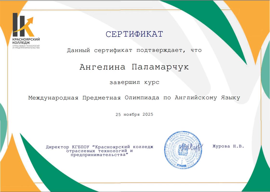 25 ноября 2025 года Миклаш Дарья (учебная группа ЛД-234) и Паламарчук Ангелина (учебная группа ЛД-242) приняли участие в Международной олимпиаде по учебному предмету «Английский язык». Подготовила участников олимпиады преподаватель Самцевич Светлана Григорьевна. Организатором конкурса выступил КГБПОУ «Красноярский колледж отраслевых технологий и предпринимательства».