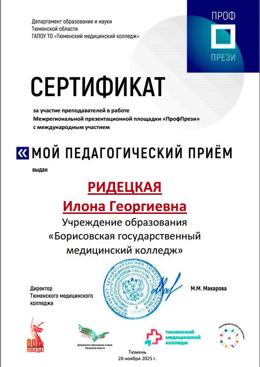 Преподаватели колледжа ежегодно становятся участниками Межрегиональной презентационной площадки с международным участием «ПрофПрези» «Мой педагогический прием». Организатор – ГАПОУ ТО «Тюменский медицинский колледж».