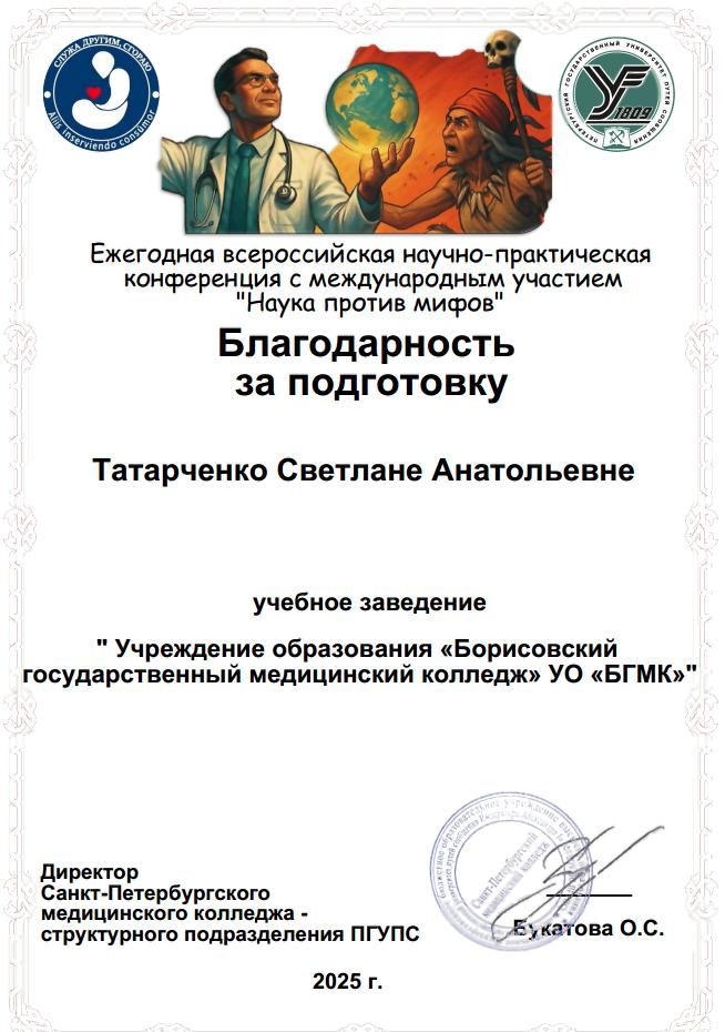 Учащаяся учебной группы СД-254 Шидловская Анна приняла участие в ежегодной Всероссийской научно-практической конференции с международным участием «Наука против мифов», которая проходила на базе Санкт-Петербургского медицинского колледжа.