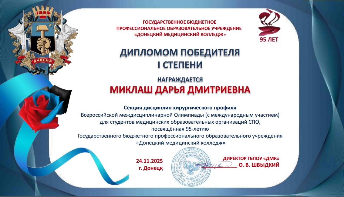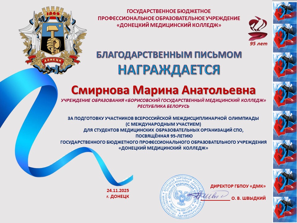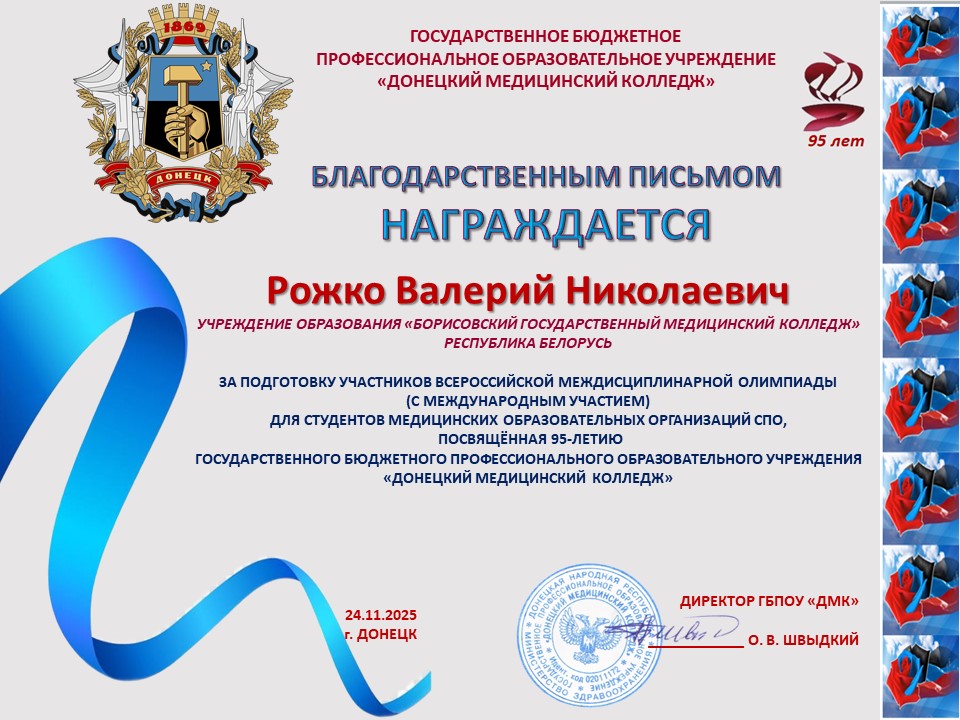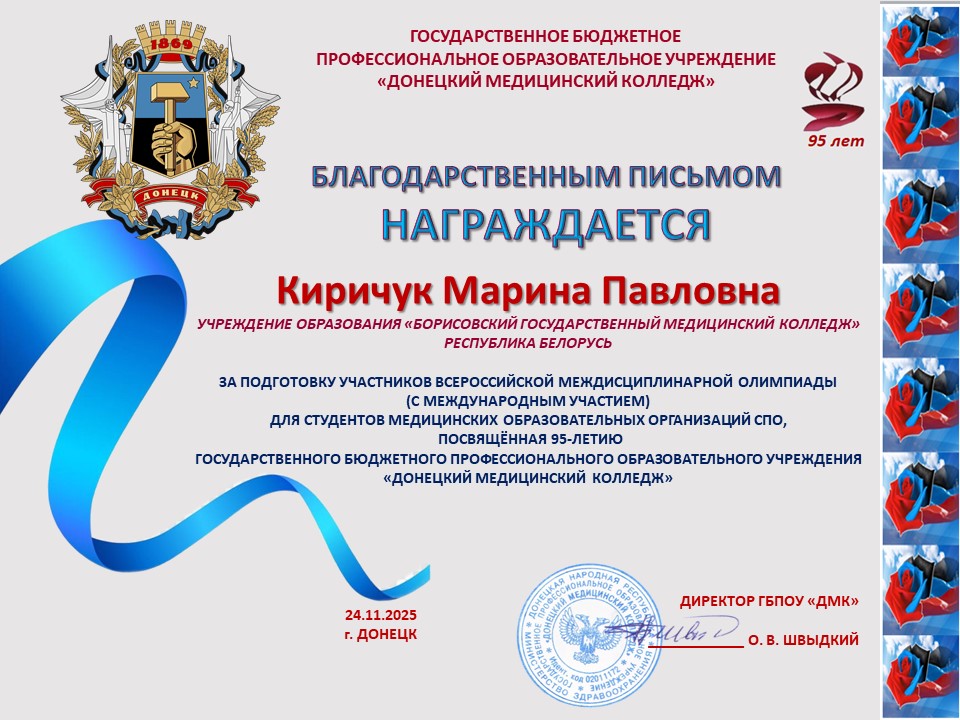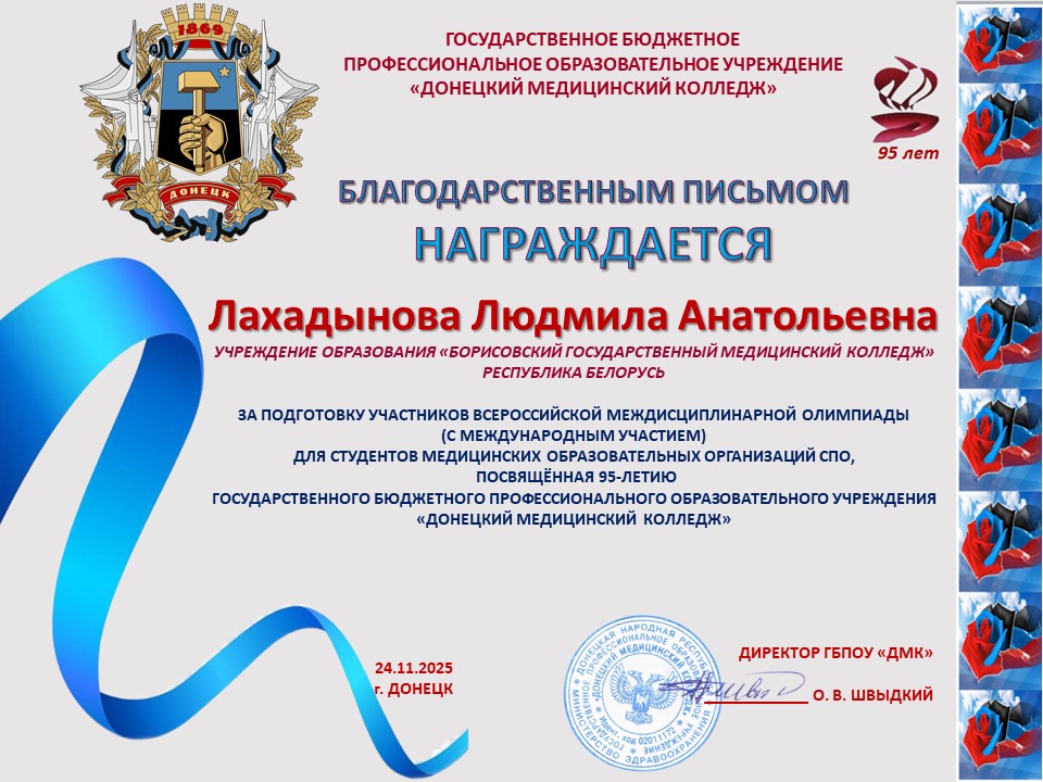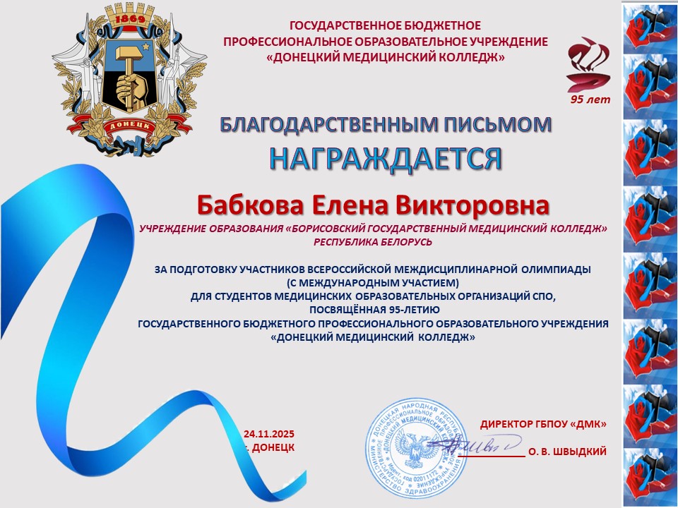 За подготовку участников Всероссийской междисциплинарной Олимпиады, посвященной 95-летию ГБПОУ «Донецкий медицинский колледж», оргкомитет направил в адрес преподавателей Бабковой Е.В., Валутова В.А., Киричук М.П., Климова Н.А., Лахадыновой Л.А., Рожко В.Н., Слоним Е.Е., Смирновой М.А. Благодарственные письма.