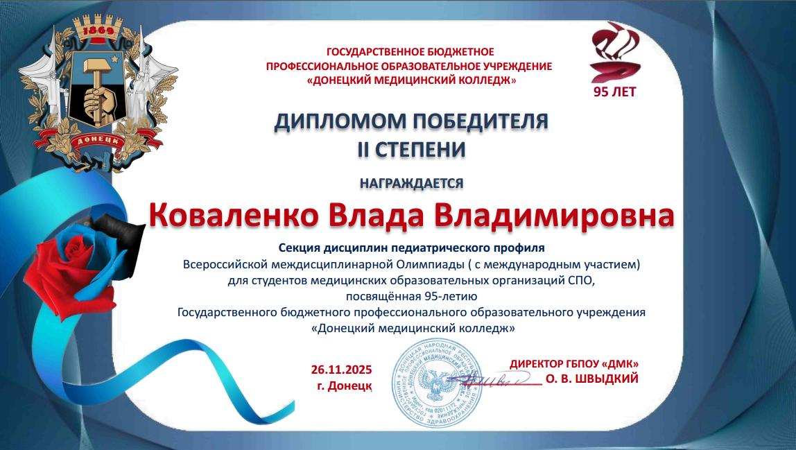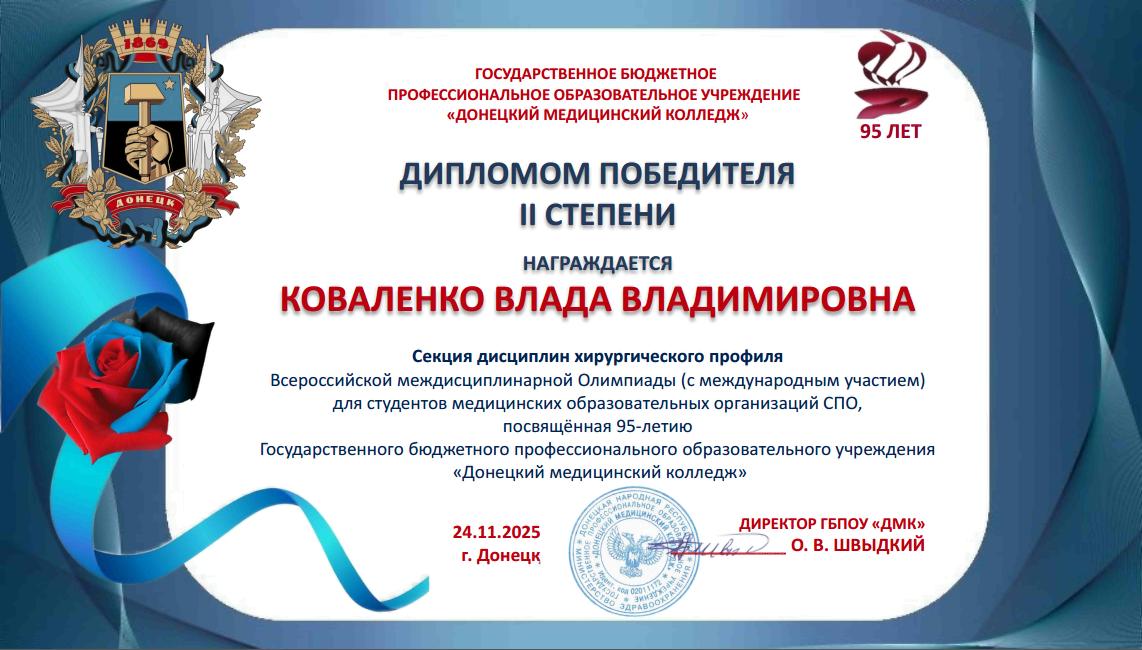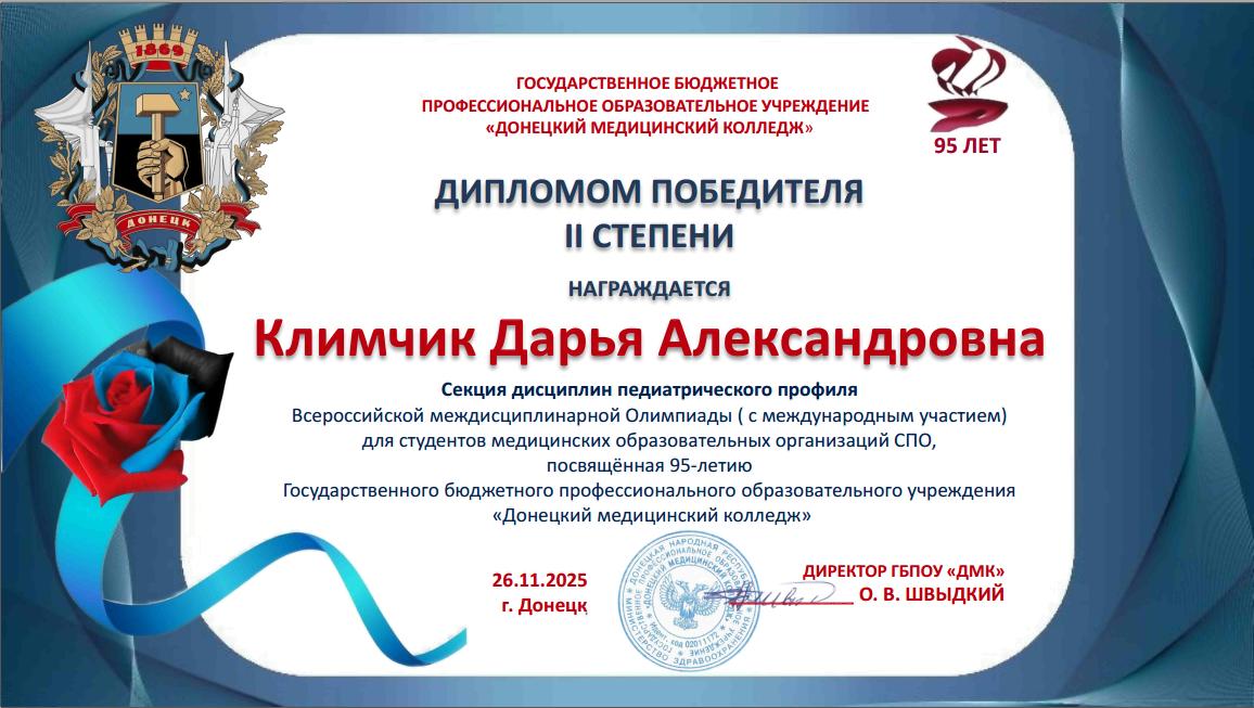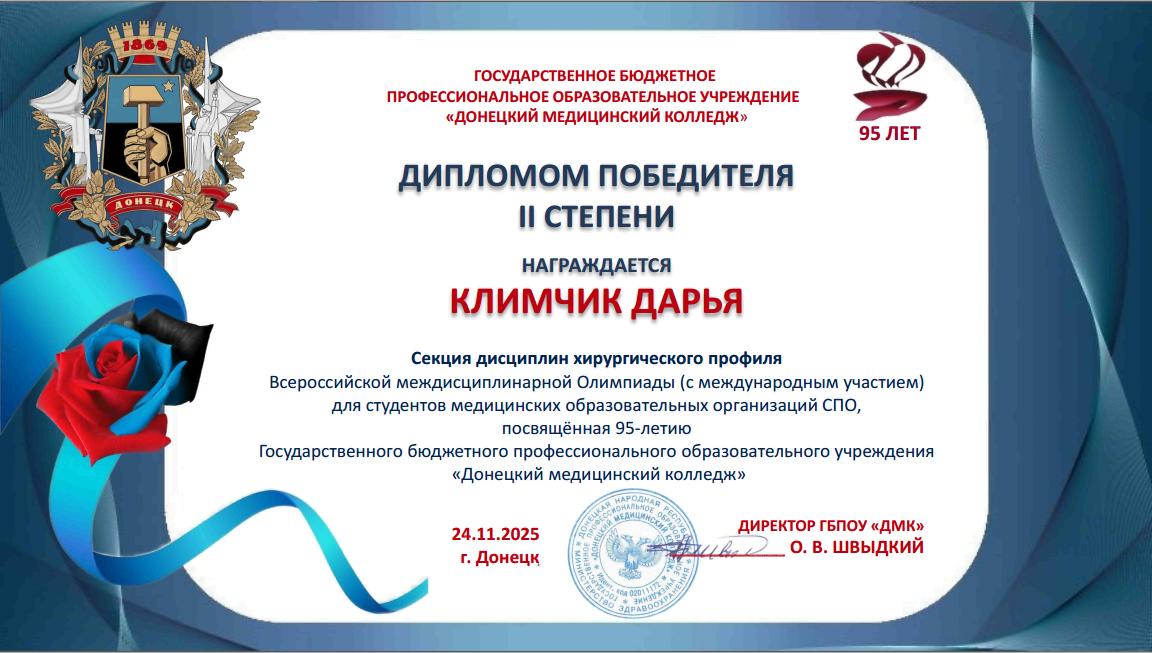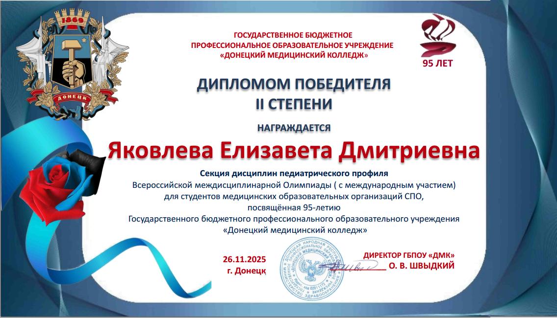 За подготовку участников Всероссийской междисциплинарной Олимпиады, посвященной 95-летию ГБПОУ «Донецкий медицинский колледж», оргкомитет направил в адрес преподавателей Бабковой Е.В., Валутова В.А., Киричук М.П., Климова Н.А., Лахадыновой Л.А., Рожко В.Н., Слоним Е.Е., Смирновой М.А. Благодарственные письма.