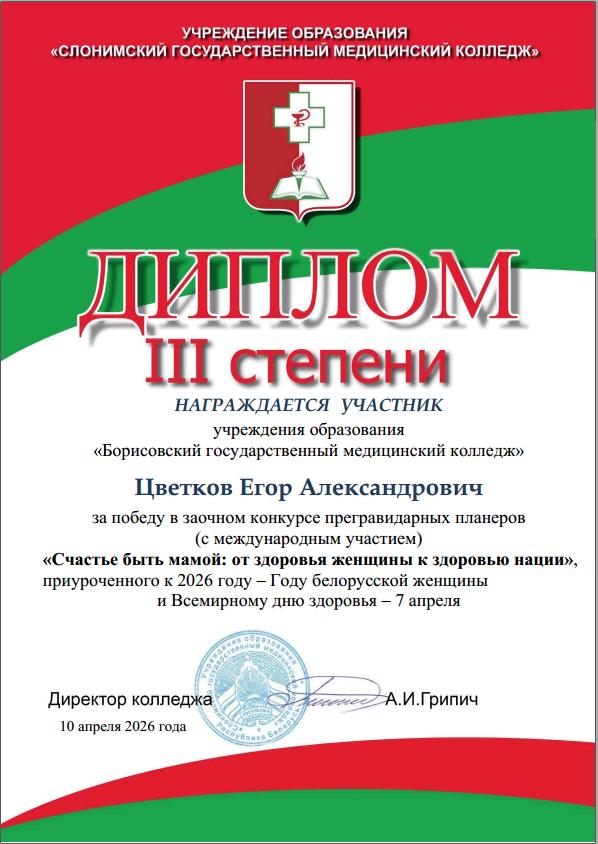 Под руководством преподавателя Игнатенко Натальи Леонидовны учащийся учебной группы ЛД-231 Цветков Егор подготовил прегравидарный планер. Работа Егора, посвященная здоровью будущих мам, удостоена Диплома III степени в конкурсе «Счастье быть мамой: от здоровья женщины к здоровью нации», организованном Слонимским медицинским колледжем.