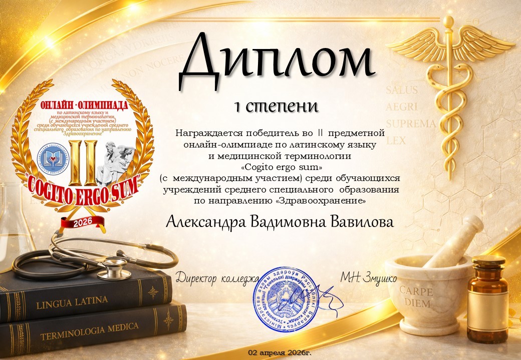 Учащиеся 2 курса продемонстрировали свои знания в области латинского языка и медицинской терминологии, приняв участие во II предметной онлайн-олимпиаде «Cogito ergo sum». Организатор олимпиады – учреждение образования «Гомельский государственный медицинский колледж».