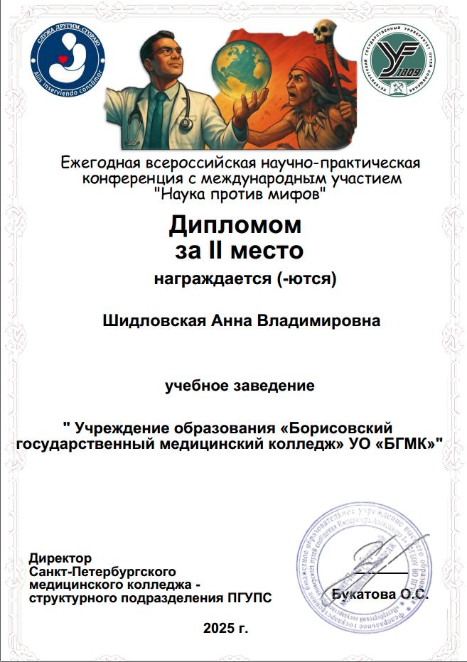 Учащаяся учебной группы СД-254 Шидловская Анна приняла участие в ежегодной Всероссийской научно-практической конференции с международным участием «Наука против мифов», которая проходила на базе Санкт-Петербургского медицинского колледжа.
