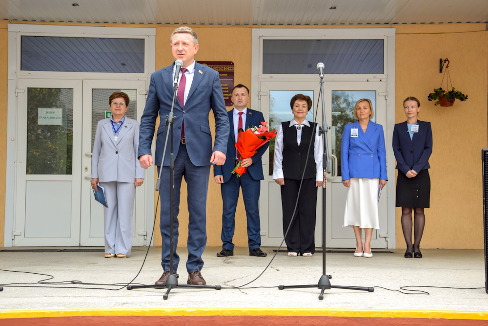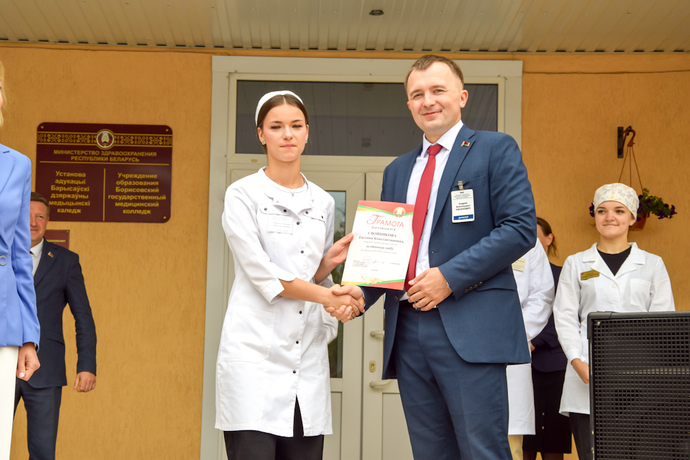 На торжественной линейке присутствовал почетный гость: начальник главного управления по здравоохранению Минского областного исполнительного комитета Шамаль И.А. В своем напутствии учащимся колледжа Игорь Александрович отметил, что только упорным трудом над освоением выбранной специальности можно достичь профессиональных успехов, и что в современных трудовых отношениях только грамотный специалист способен создать конкуренцию на рынке труда, добиться карьерного роста и работать на благо страны, а также пожелал ребятам успехов и только побед в новом учебном году.