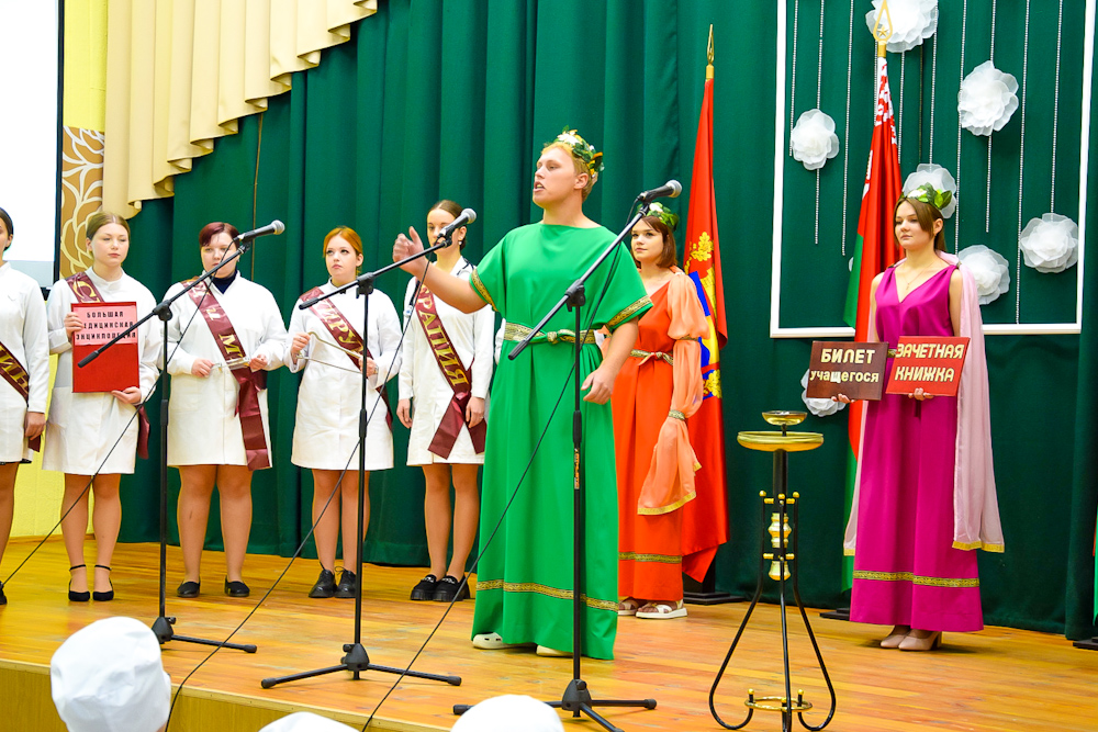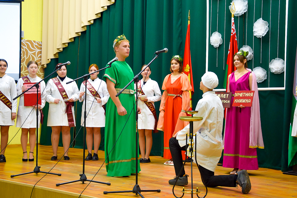 Мероприятие, проводимое в рамках Республиканской акции «Здравствуй, первокурсник!», началось с таинства – исторического театрализованного представления «Посвящение в учащиеся». На праздник были приглашены исторические фигуры медицины, такие как Гиппократ – Бог медицинской науки – со своими дочерьми Гигиеей и Панацеей, магистры сложнейших наук: Анатомия, Фармакология, Терапия, Хирургия, Акушерство, Гигиена, к которым присоединились Сессия со Стипендией и Мадам Общежитие. Они вручили ребятам студенческие билеты и зачетные книжки, которые станут свидетельством только отличных и хороших знаний. Этот момент стал символом их нового статуса и ответственности.