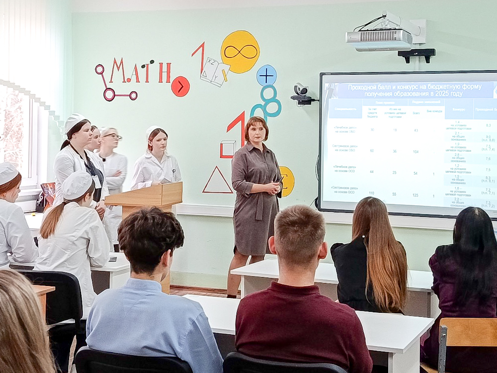 Марина Анатольевна рассказала учащимся 10-11 классов о плане набора в Борисовский медицинский колледж на 2025/2026 учебный год и Днях открытых дверей.