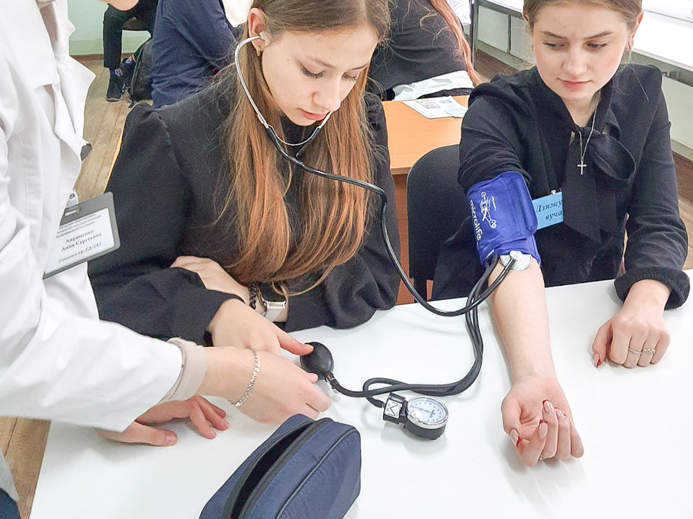 Учащиеся провели викторину по питанию, обучали правильному измерению артериального давления, раздали буклеты о последствиях курения и флаеры с информацией о колледже.