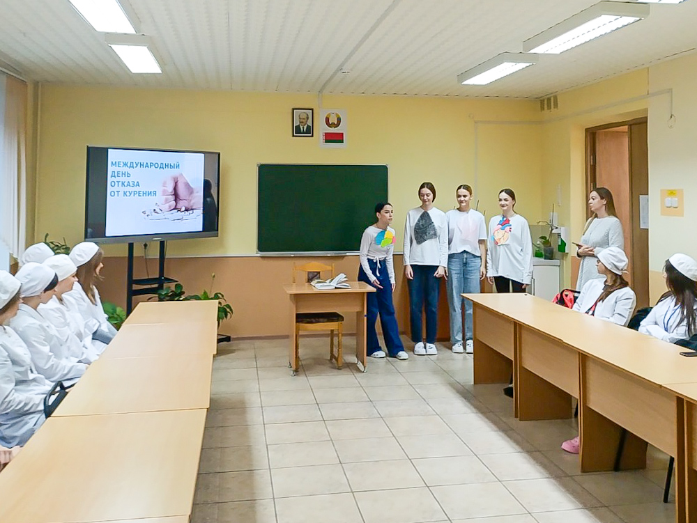 18 ноября в преддверии Международного дня отказа от курения и в рамках акции "Беларусь против табака" на кураторском часу в учебной группе СД-254 был проведен анатомический спектакль "Внутри курильщика" под руководством преподавателя Хацкевич И. В.