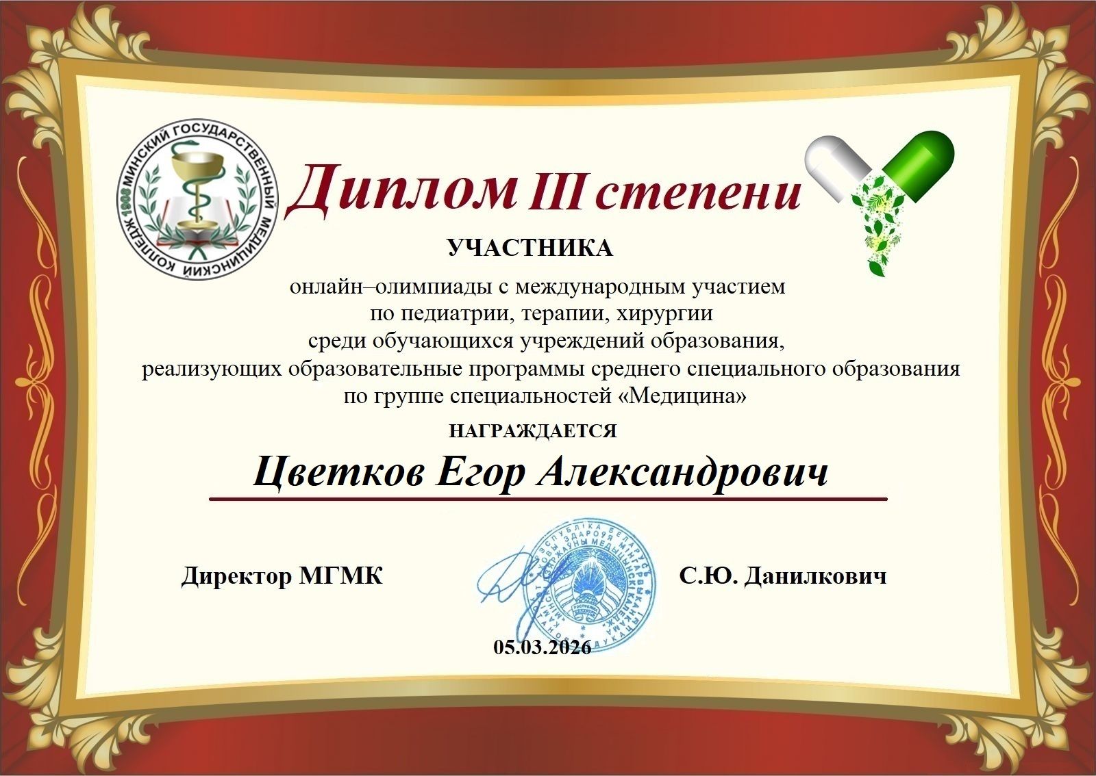 5 марта 2026 года учащиеся учебных групп ЛД-231 и ЛД-233 стали участниками онлайн-олимпиада с международным участием по педиатрии, терапии и хирургии, которую проводил Минский медицинский колледж.
